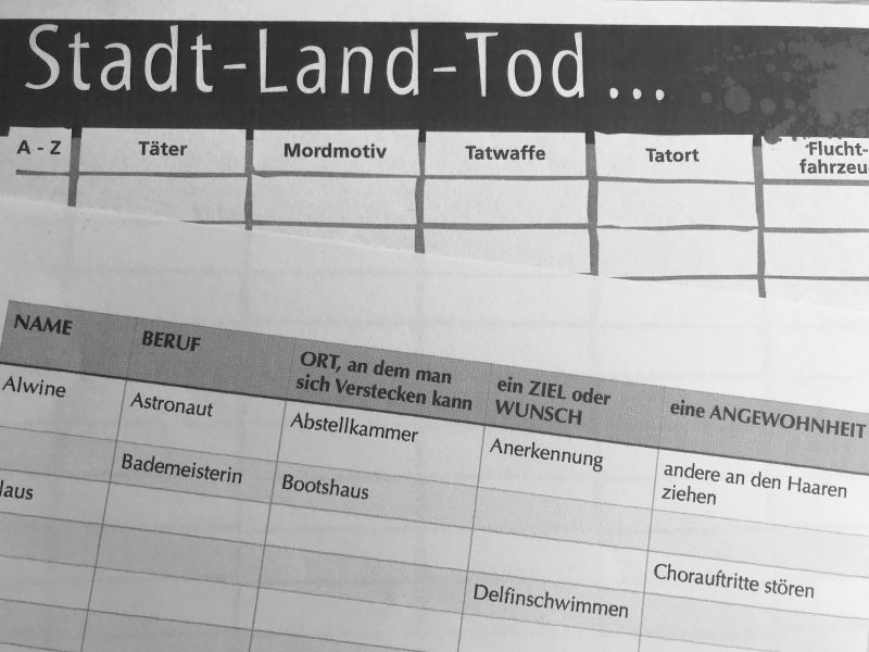 Aber andererseits habe ich die Erfahrung gemacht, dass Kreativität viel mehr als die meisten denken, Übungssache ist. Eher Herangehensweise als Talent. Und dass es gut ist, wenn eine/r mit dem Erfinden nicht bei „Null“ anfängt (ohne jede Anregung vor einem leeren Blatt Papier), sondern sich an Anhaltspunkten orientieren kann. Das kann ein Anfangssatz sein oder die Karten meines Geschichten-Generators oder … ein abgeändertes Stadt-Land-Fluss-Spiel.
