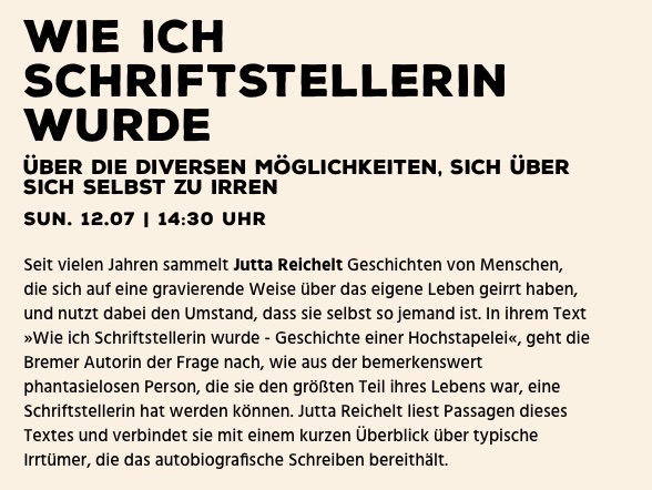 Seit vielen Jahren sammelt Jutta Reichelt Geschichten von Menschen, die sich auf eine gravierende Weise über das eigene Leben geirrt haben, und nutzt dabei den Umstand, dass sie selbst so jemand ist. In ihrem Text „Wie ich Schriftstellerin wurde. Geschichte einer Hochstapelei“, geht die Bremer Autorin der Frage nach, wie aus der bemerkenswert phantasielosen Person, die sie den größten Teil ihres Lebens war, eine Schriftstellerin hat werden können. Jutta Reichelt liest Passagen dieses Textes und verbindet sie mit einem kurzen Überblick über typische Irrtümer, die das autobiografische Schreiben bereithält.“