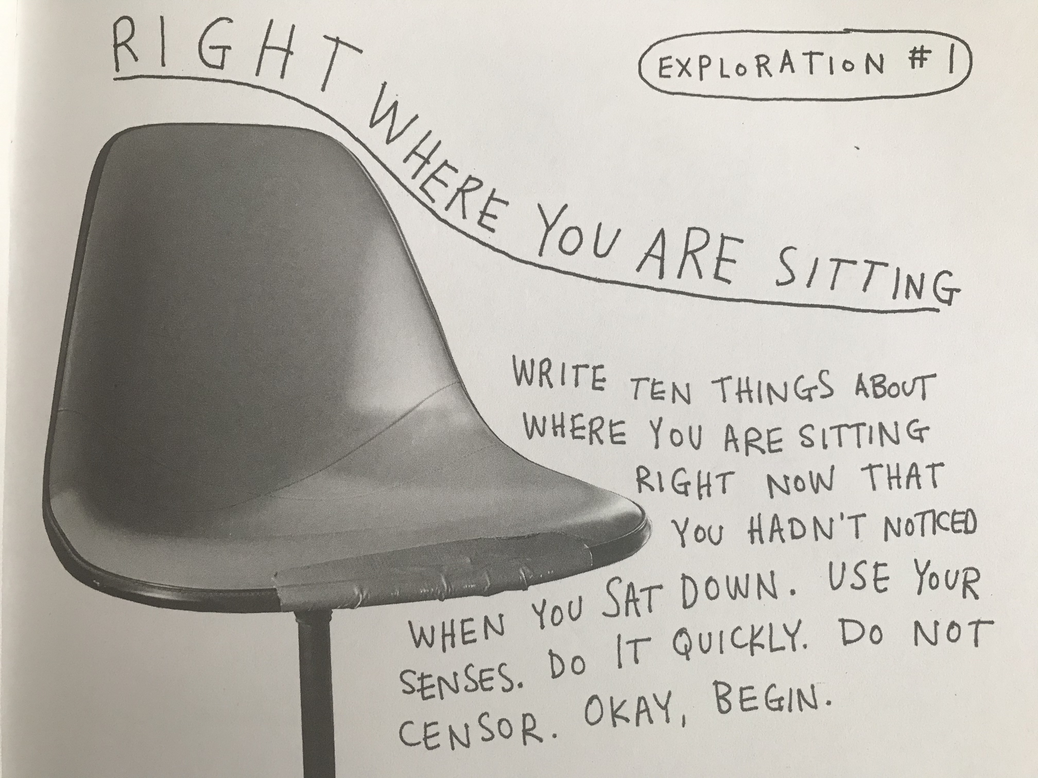 „Genau dort, wo du sitzt. Schreibe zehn Dinge auf, die du jetzt siehst und die du nicht wahrgenommen hast, als du dich gesetzt hast. Nutze deine Sinne. Mach es schnell. Zensiere nicht. Okay, fang an.“