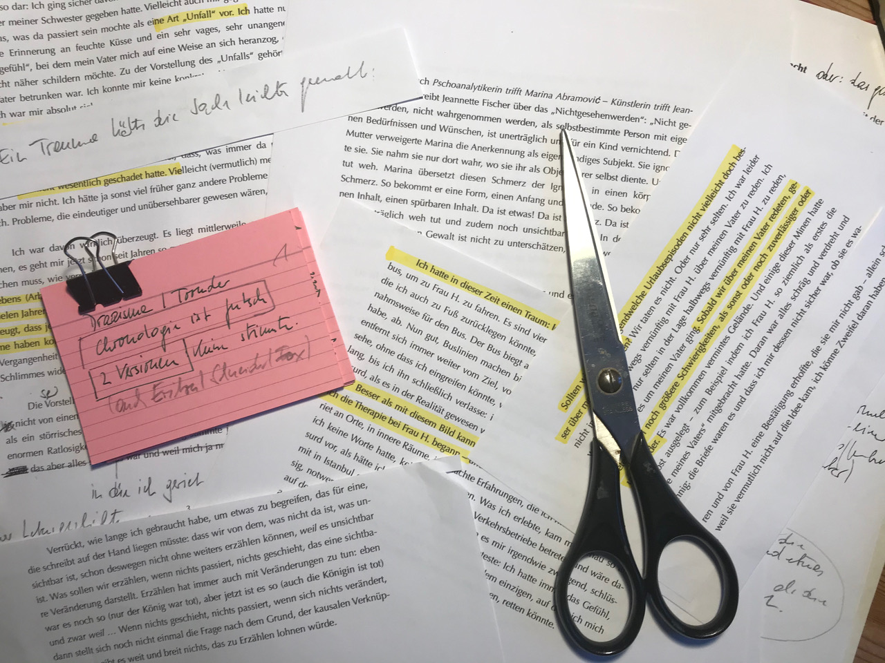 Das mache ich oft bei Texten, bei denen die Reihenfolge sich nicht „von selbst“ ergibt. Ich finde es sehr hilfreich (ich kann dann viel größere Textblöcke übersehen als am Bildschirm) und es macht mir einfach auch Spaß, den Text mit der „echten“, dreidimensionalen Schere zu bearbeiten.